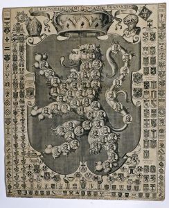 Armorial du Brabant en forme de lion. Gravure sur cuivre. Les médaillons montrent la généalogie du Duché jusqu'à Pépin de Landes. La présence des armoiries du clergé, de la noblesse et des capitales symbolisent leur participation au pouvoir ducal.