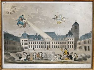 [ Bruxelles], Simoneau, [ 1856]. Lithographie, 55 x 73 cm (à vue), rehaussée à l'aquarelle, légende dans le bas (pet. taches). Sous vitre et cadre de bois doré (non désencadrée, vitre cassée au coin sup. g., dégâts à la dorure). RARISSIME GRANDE PLANCHE figurant la cour d'honneur de l'abbaye de Bonne-Espérance (commune d'Estinnes), la seule en Hainaut dont les bâtiments ont survécu aux destructions de la Révolution française. Fondation norbertine du 12e siècle, reconstruite au 18e siècle sous les architectes Nicolas de Brissy et Laurent-Benoît Dewez, petit séminaire et collège à partir de 1830. Tableau animé de putti figurant les mathématiques, la musique, la géographie et d'autres disciplines scolaires, dédié à Gaspar Joseph Labis, évêque de Tournai.