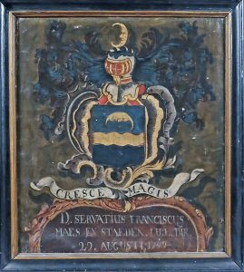PEINTURE à l'HUILE, 55 x 49 cm, sur toile (petits trous passim). Sous cadre de bois mouluré noir et or. Armoiries (lune) surmontées d'un heaume, avec moto "Cresce magis" et légende "D. servatius Franciscus Maes ex staeden. J.U.L. die. 29. augusti. 1759".