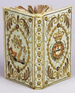 In-24, soie blanche avec décor de broderies et piécettes dorées, armes sur le premier plat, petit décor brodé montrant un animal sur le second plat, tranches dorées (Reliure de l’époque).