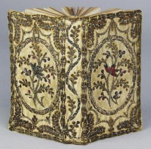 In-32, satin blanc recouvert sur les plats et le dos de broderies en fils dorés formant une composition florale dans un médaillon, tranches dorées (Reliure de l’époque).
