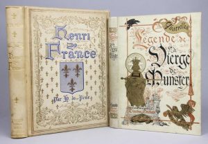 Abondante iconographie dont le portrait équestre du comte de Chambord gravé à l'eau-forte par Gaujean. On joint en cart. ill. de l’éditeur : Légende de la Vierge de Munster par Quatrelles. Ill. de Courboin. Ensemble 2 volumes.