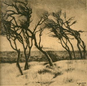 BLOMME (Alfons). Ensemble de 3 eaux-fortes en noir, titrées, signées au crayon rouge et montées individuellement sous passe-partout de toile grège et cadre doré en bois.