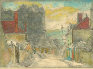 HOWET (Marie). "Saint-Ay" (1926). Aquarelle et crayon gras sur papier, titrée, datée, signée au coin infér. droit et montée sous passe-partout et cadre doré