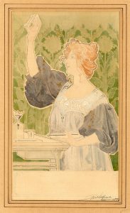 PRIVAT-LIVEMONT. Sans titre [Projet publicitaire]. Aquarelle, encre et graphite sur papier, datée (1898 ?), signée au coin infér. droit et collée sous passe-partout.