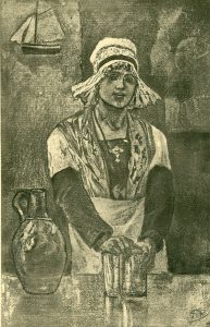 ROPS (Félicien). "La Cantinière des pilotes". Héliogravure en noir, montée sous passe-partout et cadre doré en bois.