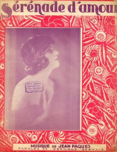 Musique de Jean Pâques. Paroles de Fernand Servais. Brux., L'Art belge, 1927, 4 p., 34 x 26,4 cm (cachet sur la couv., planche rognée, renforcements au papier collant, bord droit décoloré). Zincographie tirée en fuchsia et mauve (Schwilden, 35 C).