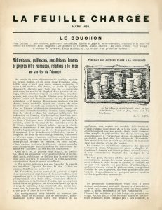 4°, 8 p. en f. Textes de P. Colinet, R. Magritte, M. Mariën, P. Nougé, L. Scutenaire. Illustré d'un "Portrait des auteurs traité à la Bouchonne" par René Magritte. Dernière manifestation collective du groupe surréaliste belge (Mariën, p. 447-454).
