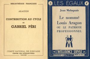 in-12, br. Edit. orig. Tirage courant après 60 pur fil.- IDEM. La Culture et les hommes. Même édit., 1947, in-12, br. Edit. orig. (pas de grand papier)./ IDEM. France écoute. Alger, Les Relais de Fontaine, 1944, in-12, br. Edit. orig. (pas de grand papier)./ IDEM. Contribution au cycle de Gabriel Péri. Toulouse, Comité national des Ecrivains, (1942), in-12, br. Edit. orig. (pas de grand papier)./ IDEM. Saint-Pol Roux ou l'espoir. P., Collection des 150 (Pierre Seghers), 1945, in-12, br. Edit. orig. tirée à 150 ex. num. 1/140 vélin du Marais./ MALAQUAIS (Jean). Le Nommé Louis Aragon ou le patriote professionnel. (Paris), Supplément à "Masses" (n° 7, février 1947), in-16, 16 p., br., couv. ill. Etat neuf. Edit. orig. rare de ce pamphlet contre Aragon./ Ens. 6 plaquettes.