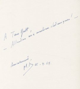 4°, 32 p., br., couv. décorée d'un collage en papier gris. Edit. orig. dont une partie du tirage a été utilisée pour la sculpture "Pense-Bête" exposée pour la première fois à la galerie Saint-Laurent à Bruxelles en 1964. Exemplaire individualisé par Broodthaers par l'addition, ici en nombre important, de papiers glacés de différentes couleurs masquant certaines parties du texte. Chaque exemplaire étant donc différent (Ceuleers et Van de Velde, 30). Dédicace au dernier feuillet : "A Tom Gutt - Attention aux machines électroniques ! - Amicalement. M.B. 15-4-64". Etat neuf.