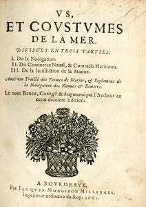 CLEIRAC. Us, et coustumes de la mer. Divisées en trois parties. I. De la navigation. II. Du commerce naval, et contracts maritimes. III. De la iurisdiction de la marine. Avec un Traicté des termes de marine, et reglement de la navigation des...