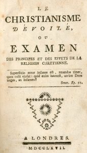 [HOLBACH (P.H. Dietrich d')]. Le Christianisme dévoilé, ou examen des principes et des effets de la religion chrétienne. A Londres, sans éditeur, 1767,