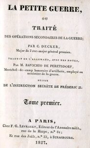 Militaria.- DECKER (C[arl VON)]. La Petite Guerre ou Traité des opérations secondaires de la guerre. Traduit de l'allemand, avec des notes, par M. Ravichio de Peretsdorf. Suivie de l'Instruction secrète de Fréderic II. Paris, F.G. Levrault, «...