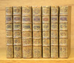 7 vol. in-12, XLIV-24-430, XVI-362, XVI-440, VII-618, [2]-557-1 blanche, [4]-362-[3]-1 blanche et [4]-86-[2]-291 (les 8 premières en chiffres romains)-1 blanche p., deux cartes dépliantes au 1er vol., plein veau brun moucheté de l'époque, dos à nerfs ornés, armoiries dorées sur tous les plats (non identifiées) (qq. accrocs aux coiffes, qq. traces d'usure, papier très lég. bruni). Bel ex. de cette édition certainement parisienne. Cf. Fr. Weil, Batailles d'éditeurs autour des oeuvres de Montesquieu, dans « Revue Montesquieu », n° 4.