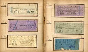 Ces tickets sont collés dans un cahier d'écolier (plusieurs tickets sont manquants). On joint 29 tickets des tramways bruxellois.