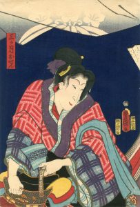 TOYOKUNI III (1786-1865). 3 estampes format oban représentant des acteurs de kabuki et une courtisane avec son shamisen.