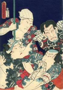 TOYOKUNI III (1786-1865). 4 acteurs du théâtre kabuki.