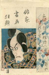 TOYOKUNI III (1786-1865). Portrait d'un acteur dans un rôle de guerrier, accolé à une calligraphie dans un tanzaku.
