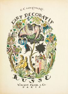 [Sergeï TCHEKHONINE] LOUKOMSKI (G.K.). L’Art décoratif russe. Paris, Vincent, 1928. In-8, broché, avec 182 planches. Couverture en couleurs de Tchekhonine. ЛУКОМСКИЙ, Георгий Крескентьевич (1884-1952) [Русское...