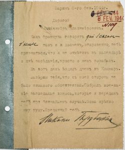8 февраля 1944 г., Париж. Машинопись с собственноручной вставкой и подписью князя Н.Трубецкого.