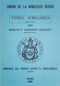KOMAROFF-KOURLOFF, Nicolas P. Titres nobiliaires 862-1917. Paris, Union de la noblesse russe, 1985. КОМАРОВ-КУРЛОВ Николай Павлович (1916-1994). [Титулатура русского дворянства: 862-1917 гг.]