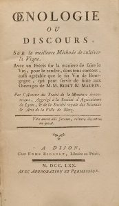 [BEGUILLET (Edme)]. Œnologie ou discours sur la meilleure Méthode de cultiver la Vigne. Avec un préfis sur la manière de faire le Vin,… Par l’auteur du Traité de la Mouture économique, Aggrégé... Dijon, Bidault, 1770. In-12, cartonnage de...