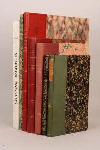 Œuvres du concours poétique sur le vin de Champagne récompensées en séance solennelle à Épernay le 24 juillet 1884. Épernay, Bonnedame et fils, 1884. In-8, bradel percaline verte (Reliure de l’époque). # BOURGEOIS (Armand). Le Chansonnier du vin de Champagne en 1890. Chalons-sur-Marne, Martin Frères, 1890. In-8, demi-maroquin bleu, dos orné, tête dorée, non rogné, couverture (L. Pouillet). Édition originale. Envoi autographe signé. Dos frotté. # ANDRÉ-BLOCH. Vieux airs français du XVIIe siècle. 20 chansons à danser et à boire reconstituées et harmonisées. Paris, Gras, 1935. In-4, bradel cartonnage marbré, couverture (Reliure moderne). Illustrations de Charles Ranc. De la bibliothèque Bernard Chwartz (2011, n°459). # VAULTIER (Roger). Chansons bachiques des provinces de France. Paris, Ponsot, 1945. In-4, broché. Édition illustrée par van Rompaey. Un des 200 exemplaires sur pur fil Lana. # ŒNOPHILOS. Le Cantique du vin. Bruxelles, s.n., 1948. In-4, demi-chagrin rouge, chiffre BC à froid, premier plat de couverture (Reliure moderne). Édition originale tirée à 275 exemplaires. De la bibliothèque Bernard Chwartz (2011, n°486). # COUVREUR (A.). Rimes gourmandes. Bruxelles, s.n., 1952. In-8, demi-maroquin rouge, chiffre BC à froid, non rogné, couverture (Reliure moderne). E.A.S. à Camille Rodier. De la bibliothèque Bernard Chwartz (2011, n°512). # LAGRANGE (A.). Moi, je suis vigneron. Villefranche en Beaujolais, Cuvier, 1960. In-8, demi-percaline bordeaux (Reliure moderne). De la bibliothèque Bernard Chwartz (2011, n°512).
