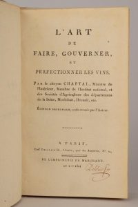 Édition originale de toute rareté du premier grand traité d’œnologie de Chaptal. # Exemplaire de premier tirage, à l’adresse quai des Augustins n°29 avec la mention de l’imprimeur Marchant sur le titre et le feuillet de table non chiffré. Signature autographe de l’éditeur sur le titre. # La première page du texte est titrée Essai sur le vin par le C. Chaptal et porte dans la marge inférieure la mention tome II rayée. Cet état semble être un tiré à part du Traité théorique et pratique sur la culture de la vigne de Chaptal, Rozier, Parmentier et Dussieux paru chez le même éditeur la même année. # Fritsch, n°118.