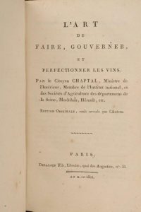 Édition originale du premier grand traité d’œnologie de Chaptal. # Il s’agit d’un second état : le titre ne porte pas l’indication De l’Imprimerie de Marchant. L’adresse de l’éditeur Delalain fils a changé : il est au 38, quai des Augustins et non plus au 29 ; la table du chapitre est numéroté 196 alors qu’elle n’est pas chiffrée dans le premier état. # L’Art de faire le vin de Cadet-de-Vaux relié en tête du volume est cité par Vicaire comme un ouvrage très technique. Il fut publié pour la première fois en 1801. # Étiquette manuscrite Bibl. Stadl. CC. # Fastes, n°950 (Chaptal).