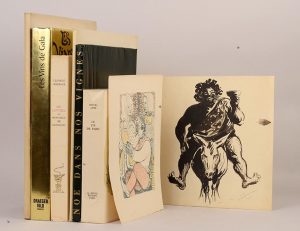 ALMANACH du Beaujolais 1931. Villefranche en Beaujolais, Guillermet, 1931. In-8, broché, non rogné. Un des 30 exemplaires sur Montval de Canson et Montgolfier. # MORRAYE (C.). Les Lettres de Monsieur Grandcru ou La Science exacte et souriante des grands vins. Bruxelles, Desmet-Verteneuil, 1946. In-4, broché. Édition originale et premier tirage des 22 planches de Nojorkam. E.A.S. adressé à son altesse impériale le prince Napoléon. # SERRES (O. de). Escrit sur le vin et la vigne & autres gentillesses procédantes de raisin. Paris, A l'Enseigne de Colbert, 1947. In-4, en feuilles, chemise et étui. Édition illustrée de lithographies de Maurice Savin. Tirage à 305 exemplaires sur Lana. # MURET (Albert). Noé dans nos vignes. Zürich, Office de propagande [...] suisse, 1952. In-4, broché, couverture de papier vert bronze de l'éditeur. Édition originale illustrée par M. Monnerat. Exemplaire sur vergé. # CADILHAC (P.-É.). A l'enseigne de Bacchus. Variations sur les ordres bachiques de l'ancienne et de la nouvelle France. Paris, Deux-Rives, 1953. In-4, en feuilles, couverture illustrée, chemise et étui. Édition originale de ce chef-d'œuvre de la littérature gastronomique contemporaine, illustrée de lithographies d'André Galland. Un des 50 exemplaires sur hollande van Gelder Zonen, contenant deux in-texte originaux et une suite en noir, celui-ci nominatif pour Madame Irène Lambin. # BERENGIER (Auguste). Lettres de noblesse des vins de Cassis. Marseille, Audry, 1956. In-4, broché, couverture rempliée. Édition originale illustrée par Sylvain Coste. # MINOT (Paul). Petit Louis. Vigneron de Pouilly. Paris, Atelier Pompougnac, 1958. In-4, en feuilles, couverture rempliée. Édition originale illustrée de 10 pointes-sèches originales de R.W. Thomas. Tirage à 300 exemplaires sur pur fil Johannot. # AYMÉ (Marcel). Le Vin de Paris. Paris, La Belle Édition, s.d. [1966]. In-8 carré, broché. Édition illustrée de nombreuses planches hors texte en couleurs par Gaston Barret. Un des 15 exemplaires de tête sur vergé de Lana contenant une suite en noir (15 planches) et une aquarelle originale. # DALI (Salvador). Les Vins de Gala. S.l., Draeger, 1977. In-4, cartonnage d'éditeur. Édition originale abondamment illustrée.
