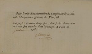 La Richesse des Vignobles, partie des vins formant le complément de la nouvelle Manipulation générale des Vins,… Paris, Musier, Gobreau, 1781. 28 pp. Édition originale. Fritsch, n°101, 1). # Expériences principales et instructives de la Nouvelle Manipulation des vins faites et multipliées depuis 1771 jusqu'à présent dans les différentes Provinces de Vignobles de France, et particulièrement sur les premiers vins de la Bourgogne et de la Champagne, et même en plusieurs pays étrangers. Paris, Musier, Gobreau, 1781. 32 pp., 2 ff., 30 pp., 1 f. (reçu signé par Maupin pour l'achat d'un exemplaire). Édition originale. Fritsch, n°101, 2). # Considérations sur l'art de la vigne, et sur la seule richesse du peuple. [Paris, 1781]. 14 pp. # Avis et leçon à tous les laboureurs, cultivateurs, etc. ou théorie d'un nouveau système général pour l'administration économique de toutes les parties de l'Agriculture et principalement des terres labourables, à l'usage de toutes les nations. Paris, Musier, Gobreau, 1781. 61 pp. (1) p. Édition originale. Fritsch, n°102, 2). # Lettre d’un principal propriétaire des terres, adressée à M. Maupin, et par lui publiée, sur les disettes passées, présente & à venir… Paris, Musier, Gobreau, 1785. 28 pp. Édition originale.