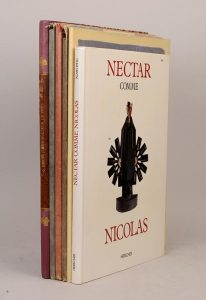 Blanc et Rouge. – Rose et Noir. – Bleu Blanc Rouge. Paris, 1930-1932. 3 volumes, in-4, broché. Collection complète de cette prestigieuse publication. Le premier album intitulé La Belle au bois dormant, rédigé par Georges Montorgueil, est orné de 10 illustrations à pleine page de Paul Iribe. Le second, Le Mauvais génie, est une suite de 9 planches caricaturales d'Iribe, précédé d'un livret par René Benjamin. Le dernier, France, comprend 6 planches d'Iribe dont 4 dépliantes. # Le Génie du vin. Paris, 1972. In-4, broché. Plaquette illustrée de 13 gouaches d’André Derain. Un des 300 exemplaires du tirage de tête. # Mon docteur le vin. Paris, 1936. In-4, bradel demi-percaline violette, couverture (Reliure de l’époque). Textes de Gaston Derys. Aquarelles de Raoul Dufy. # Atlas viticole de la France dressé spécialement pour les Établissements Nicolas. Album in-4 oblong, percaline grise (Magnier). Rare atlas renfermant 9 cartes rehaussées en couleurs, la plupart dépliante. # On joint : WEIL (Alain). Nectar comme Nicolas. Herscher, 1986. In-4, percaline sous jaquette illustrée de l’éditeur. Intéressant ouvrage sur les publicités des établissements Nicolas.