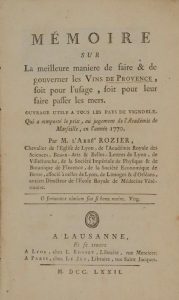 [PROVENCE]. ROZIER (Abbé François). Mémoire sur la meilleure manière de faire et de gouverner les vins de Provence, soit pour l'usage, soit pour leur faire passer les mers. Ouvrage utile à tous les pays de vignobles... Lausanne ; Lyon, Rosset ;...