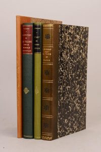 DEJERNON (R.). La vigne en France et spécialement dans le Sud-Ouest. Extrait des conférences faites dans les Basses-Pyrénées. Pau, A. Lafon, 1867. In-8, demi-maroquin vert, dos orné, non rogné, couverture (Reliure pastiche). # BESSIÈRES (E.). De la vinification et du vin de Tarn-et-Garonne. Toulouse, Privat, 1874. In-8, demi-basane ocre, chiffre BC, dos lisse, couverture (Reliure moderne). De la bibliothèque Bernard Chwartz. # TOCHON (P.). L’art de faire le vin et de lui conserver ses qualités. Montpellier, Coulet ; Paris, Delahaye, Lecrosnier, 1888. In-8, bradel percaline verte, non rogné, couverture (Ateliers Laurenchet). Deuxième édition. # LAFON (R.). La Culture de la vigne dans l’arrondissement de Barbezieux. Ouvrage publié sous le patronage de M. Jean Hennessy. Paris, Baillière, 1912. In-8, bradel demi-percaline verte, non rogné, couverture (Ateliers Laurenchet). Deuxième édition de cet excellente monographie sur la viticulture des Charentes, illustrée de 49 vignettes et figures. Cachet du distillateur Estignac à Fonzac répété.