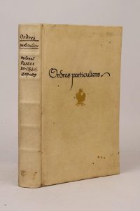 [MANUSCRIT]. CASTEX (Bertrand-Pierre de). Ordres particuliers. – Ordres généraux. 1807-1809. 2 parties en un volume in-8, vélin rigide, aigle impériale dorée et titre calligraphié à l'encre noire au centre du plat supérieur, dos à nerfs...