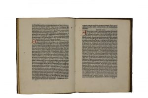 In-4° (mm 205x152). Carte [77] (di 78). Segnatura: a-i8(-b1) k6. Testo in carattere romano (R 82) su 36 linee. Interamente rubricato in rosso. Esemplare mancante di una carta di testo, con un piccolo restauro nel bordo interno del frontespizio e 2 forellini di tarlo marginali all'ultimo quaderno. Legatura muta ottocentesca in cartonato marmorizzato, lievemente consunta. Cfr. BMC V, 416; Goff I-45; GW M46878; Hain-Copinger (+Add) 9126; Proctor 5124.