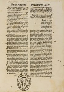 Ambrosius (santo), [Opera. Pars prima]. [(Al colophon:) Basilee: Iohannem de Amerbach, 1492.]