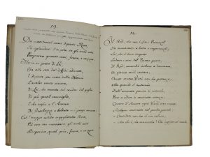Manoscritto a inchiostro nero (mm 260x180). Pagine numerate da 496 a 660. Legatura in mezza pergamena con angoli. Si tratta della "Parte Terza" che contiene "Sonetti, Madrigali, Ballate, Epigrammi", alcuni anti napoleonici. Es. «Ogni suo motto di nequizia è pregno E Orgoglio e fiel e villania trabocca: Voce decora da l'immonda bocca Come usciria d'un tal Fellone indegno?». L'Accademia Pastori della Dora venne fondata nel 1804 da Prospero Balbo, padre di Cesare, insieme all'Accademia dei Concordi. Aveva sede in Via Bogino 8 a Torino. Lo scopo dell'associazione era "lo studio della lingua italiana". Carlo Antonio Pullini di S. Antonio (1746-1816) fu anche membro dell'Accademia delle Scienze di Torino.