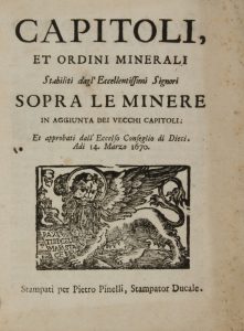 Capitoli, et ordini minerali stabiliti dagl'eccellentissimi signori sopra le minere in aggiunta dei vecchi capitoli. Et approbati dall'eccelso Conseglio di Dieci. Adi 14. Marzo 1670. [Venezia]: Gio. Pietro Pinelli, stampator ducale, [1670].