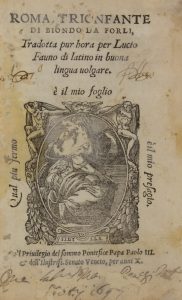 Biondo Flavio, Roma trionfante [...] tradotta [...] per Lucio Fauno di latino in buona lingua volgare. (Al colophon): In Venetiis: per Michiele Tramezzino, 1549.