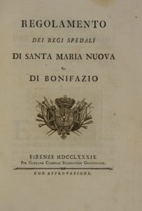 Covoni Girolami Marco-Chiarugi Vincenzo, Regolamento dei Regi Spedali di Santa Maria Nuova e di Bonifazio. Firenze: per Gaetano Cambiagi Stampatore Granducale, 1789.