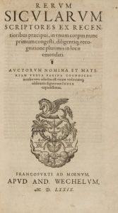 Fazello Tommaso, Rerum Sicularum scriptores ex recentioribus praecipui, in unum corpus nuns primum congesti... Francofurti: apud And. Wechelum, 1579.