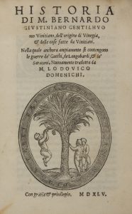 Giustiniani Bernardo, Historia […] dell'origine di Vinegia e delle cose fatte da Vinitiani. Venezia: Bernardino Bindoni, 1545 (Al colophon:) Stampata in Vinegia: per Bernardino Bindoni milanese, 1545.