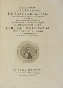 Marini Gaetano, Gli atti e monumenti de' Fratelli Arvali scolpiti già in tavole di marmo ed ora raccolti e diciferati e comentati [...]. Parte prima (-seconda). In Roma: presso Antonio Fulgoni, 1795.