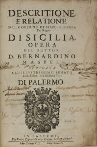 Masbel Bernardino, Descritione e relatione del governo di stato, e guerra del Regno di Sicilia... In Palermo: per Pietro Coppola, 1694.