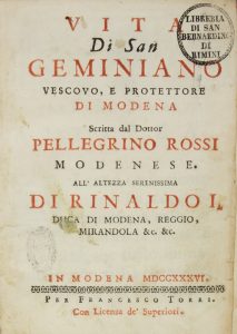 Rossi Pellegrino, Vita di san Geminiano vescovo, e protettore di Modena... In Modena: per Francesco Torri, 1736.