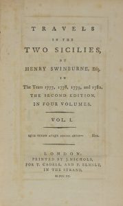 Swinburne Henry, Travels in the two Sicilies [...] in the years 1777, 1778, 1779, and 1780 [...]. Vol. I (-IV). London: Printed by J. Nichols for T. Cadell and P. Elmsly, 1790.