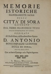 Tuzii Francesco, Memorie istoriche massimamente sacre della città di Sora... In Roma: nella stamperia di Antonio de' Rossi, nella strada del Seminario Romano, 1727.
