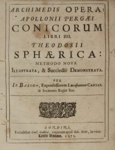 Archimedes, Archimedis Opera: Apollonii Pergaei Conicorum libri 4. Theodosii Sphaerica... Londini: excudebat Guil. Godbid, 1675.
