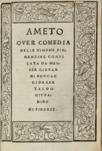 In-8° (mm 150x100). Carte 95, 1 bianca. Frontespizio incorniciato da bella cornice xilografica a motivi fitomorfi. Esemplare leggermente rifilato, piccola abrasione al frontespizio, ma complessivamente in buone condizioni di conservazione. Graziosa legatura moderna in pieno marocchino rosso con titolo impresso in oro al dorso a 5 nervetti. Dentelles dorate alle unghiature, sguardie in carta decorata. Tagli marmorizzati. Traccia di colla al dorso. Note manoscritte parzialmente rifilate all'interno del testo. Terza edizione veneziana, la prima per i tipi di Gregori. Cfr. Adams B-2127; Sander 1058, Zambrini I,142. Gamba (200, 201) cita altre edizioni e aggiunge: «col titolo di Ameto comedia delle ninfe fiorentine ebbe quest'operetta (tutta frammischiata di versi e prose, e che ha poi avute molte imitazioni, e principalmente l'Arcadia di Sannanzaro, e gli Asolani di Bembo) molte ristampe».